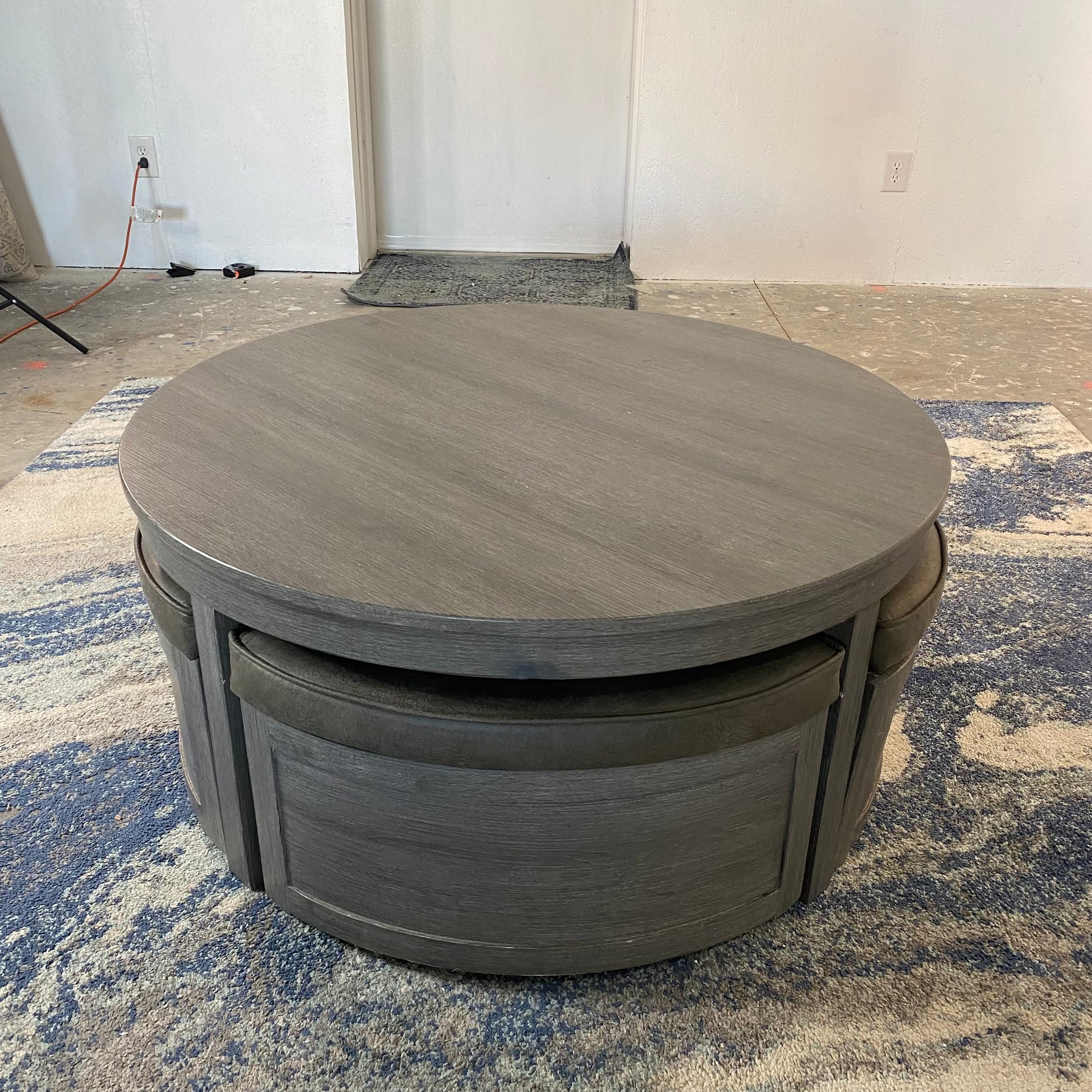 I have a really nice 5Pc Rooms To Go Darien cocktail/coffee table with rolling ottomans for storage