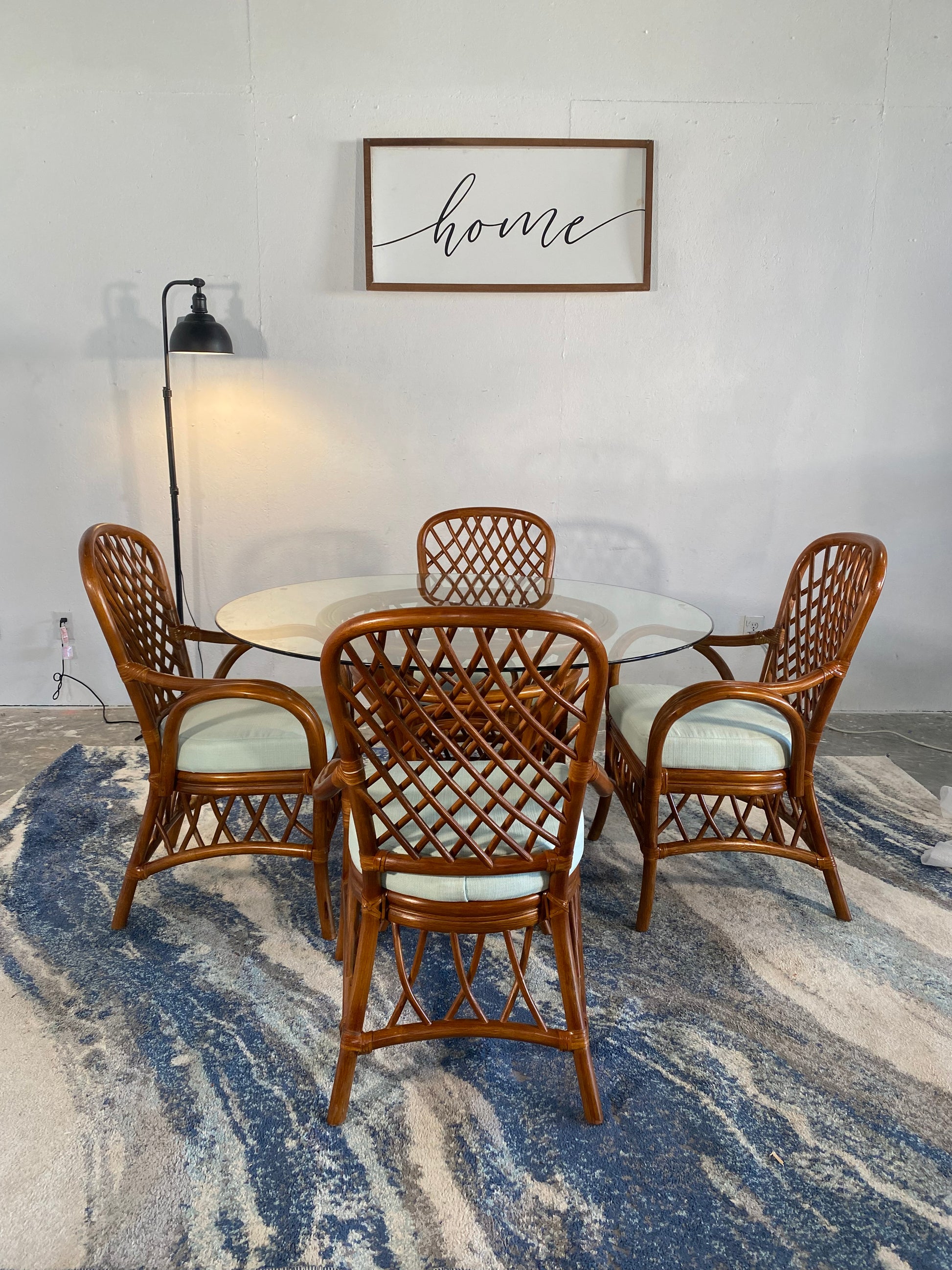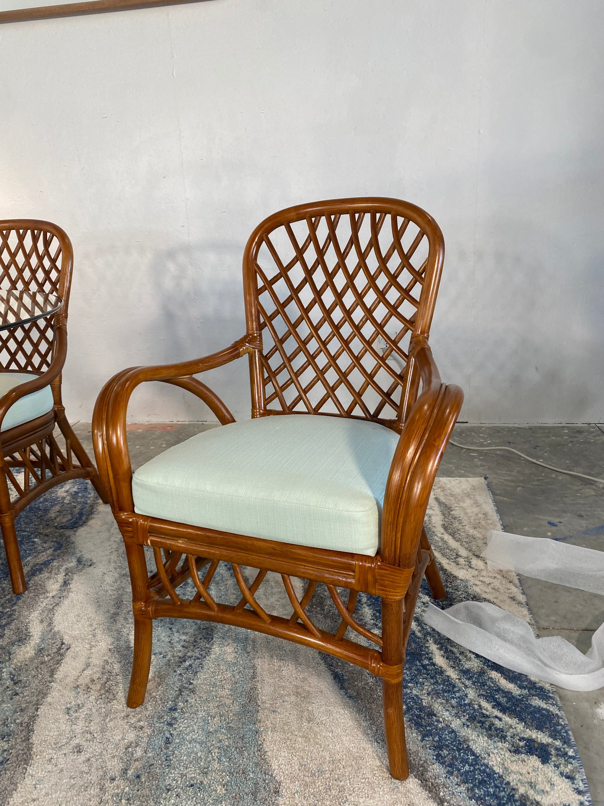 Glass top. Rattan frame. Comfortable upholstered seats.